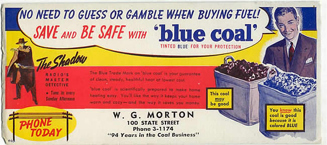 Blue Coal advertisements live on today in podcasts of RKO Studio’s “The Shadow,” featuring Orson Welles.